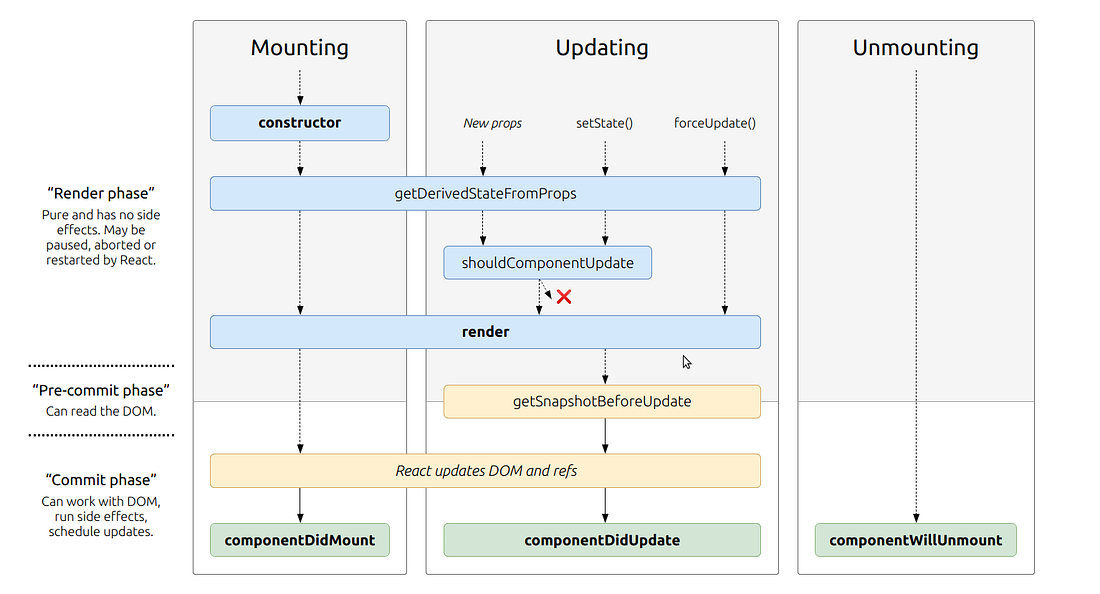 Constructor -> render -> React updates -> componentDidMount -> componentWillUnmount